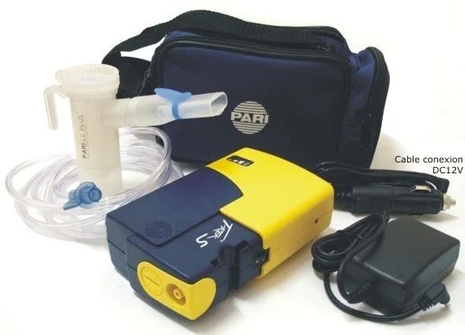 Sistema de aerosol portátil diseñado para terapias respiratorias, ideal para uso en casa o en movilidad. Funciona con corriente eléctrica, adaptador para auto y batería (opcional).